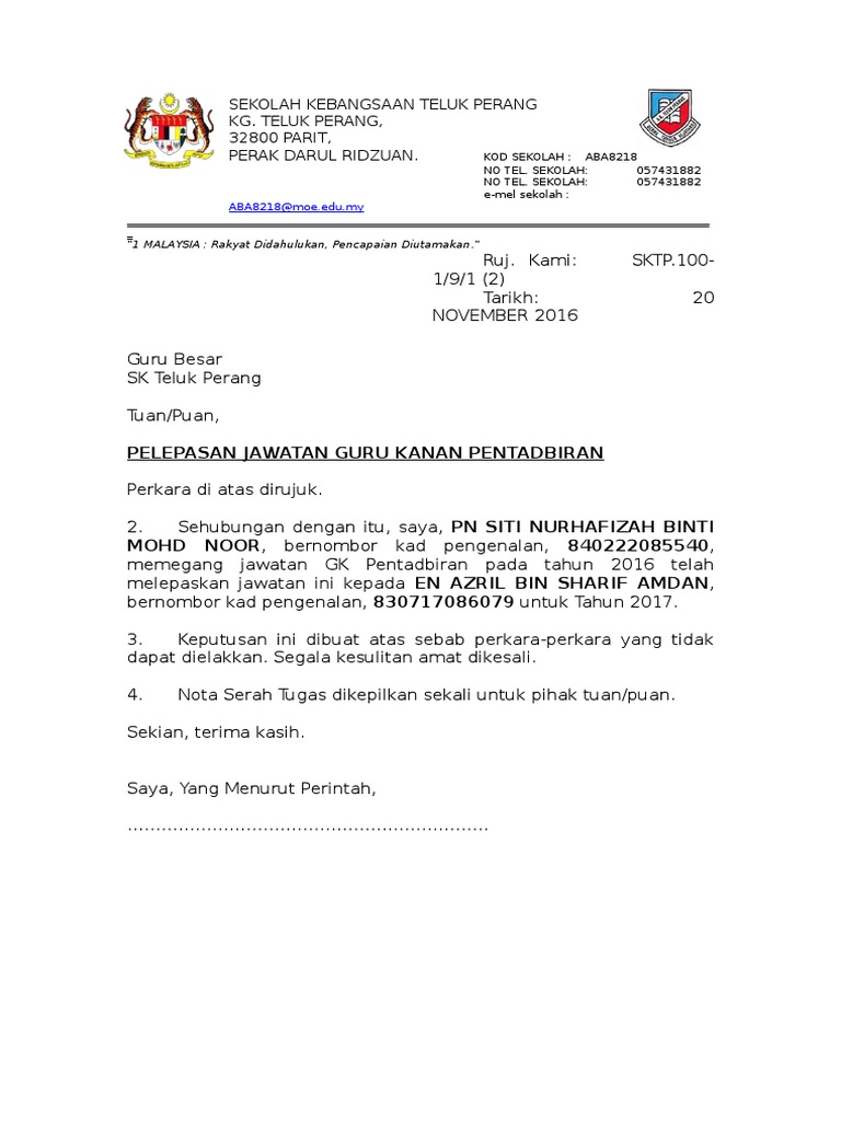 Mr Adam Syahmi Manager Dp Networks 456 Jalan Gemilang 33456 Seri Iskandar Perak Malaysia. Contoh Surat Perletakan Jawatan Dalam Bahasa Inggeris. Saya Adam Haris Bin Ahmad Tarmizi 123456-78-9012 JAWATAN SEKARANG yang sedang berkhidmat di TEMPAT KERJA SEKARANG dengan ini memohon untuk melepaskan jawatan dengan izin bagi membolehkan saya menjawat jawatan baru iaitu JAWATAN BARUTarikh pelepasan jawatan dengan izin ini berkuatkuasa dengan tarikh saya melapor diri.